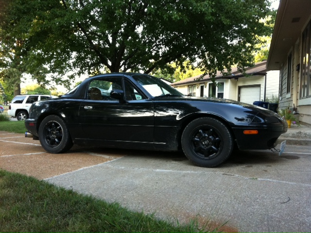 whats up everyone i just got a 93 miata with 160k onit.its all power tan leather.got it bout a mth ago.so far ive done new water pump,radiator,belts,ac compressor,alt.needed alot of work then i lowered it put a muffler onit and got a hardtop and got some victor racer v700 tires there 205 55 r14.so far its coming along.next is boost it and roll bar.then i need todo alot of body work it has hail damage.but lmk what you guys think.thanks