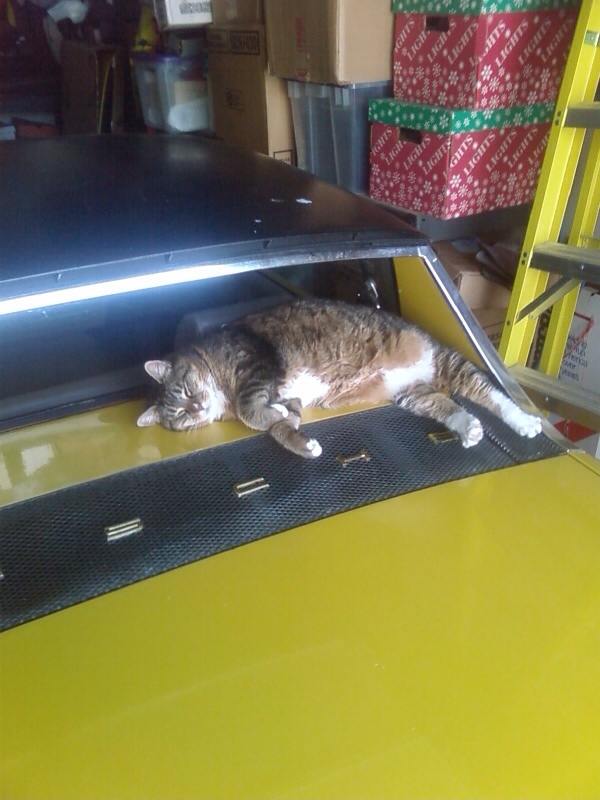 rear shelf of a 914 = perfect spot for sleepy kitty. Ignore the scat, lol
