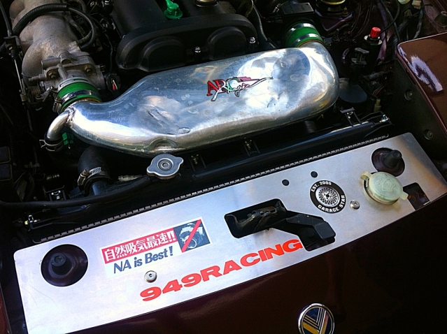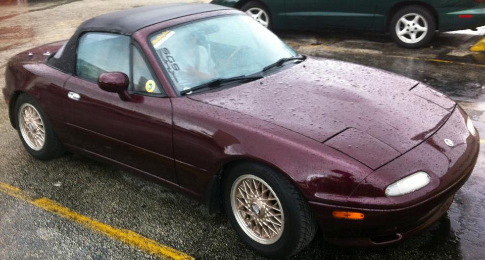 Mods thus far consist of an ARC Power chamber intake, Fujitsubo RM-01A exhaust, Mazdaspeed plug wires. I'm running on Tokico Blue shocks with ebay Coilover sleeves. My wheels are from an E30 M-Technic Miata, which I had resprayed to what they look like now.