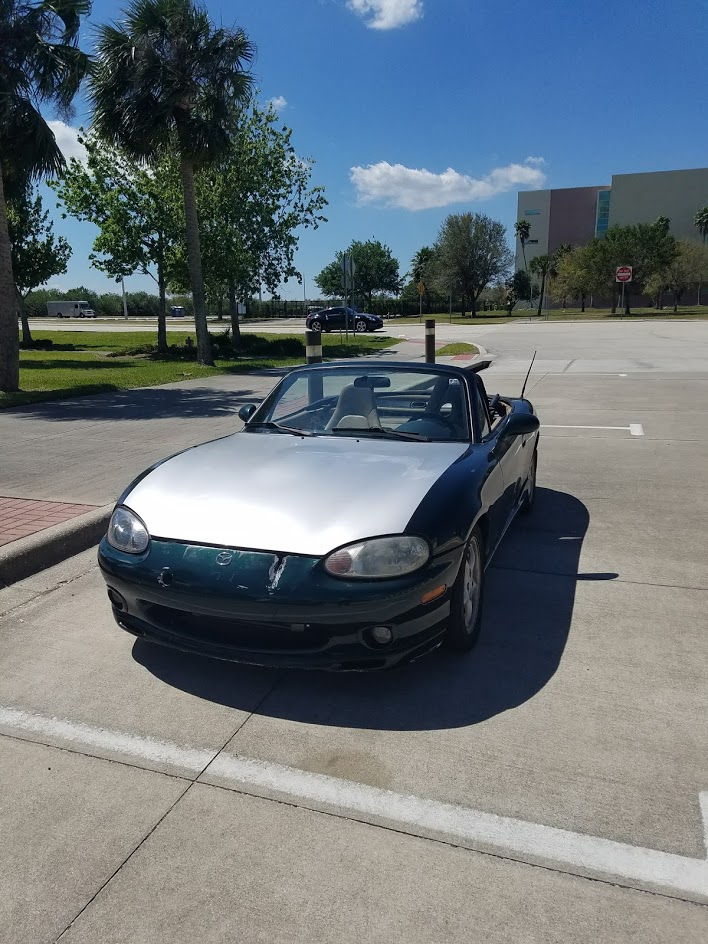 So, here's my intro post. I'm 6'4" and this is my first Miata, a '99 NB. I'm 31 years old and a hobbyist mechanic, welder, fabricator. I received this Miata as a partial trade toward a car I sold. Before I even drove the car I modified the floor pan, installed a racing seat, and built a turbo kit. Just a note, the bumper was that way when I got it.