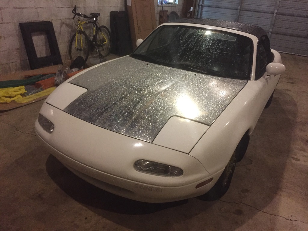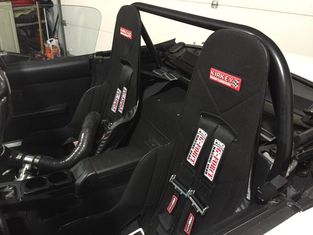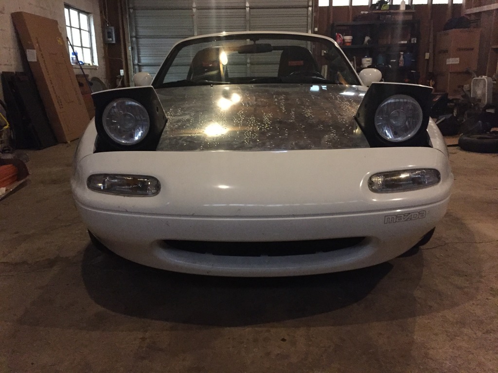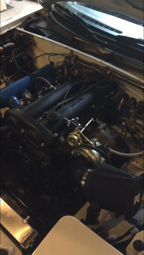 I decided to look for a Miata when my wife said she was no longer comfortable on the back of my motorcycles. In Ohio most NA's or NB's are full of rust so finding a nice body was my top priority. I found a ridiculously clean NA that was an abandoned turbo project, but had all the right parts. The previous owner had the engine built with manley rods and 8.5 to 1 wisecos and all new bearings and had the documentation. It also has megasquirt2 PNP, deatschwerks 1000cc injectors, deatschwerks fuel pump, boundary engineering oil pump, FM intercooler and piping, begi intake manifold, unknown cast exhaust manifold and a t3 48 trim china turbo. Other non-engine mods are clutch and flywheel, 949 driveshaft, a real roll bar, kirkey seats, harnesses, gauges, coilovers, etc.