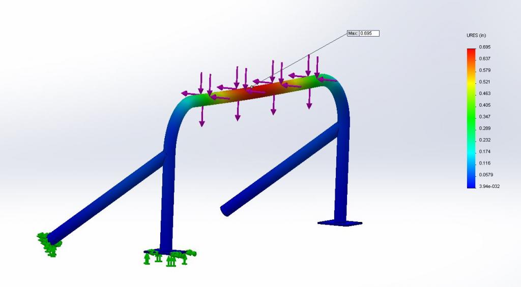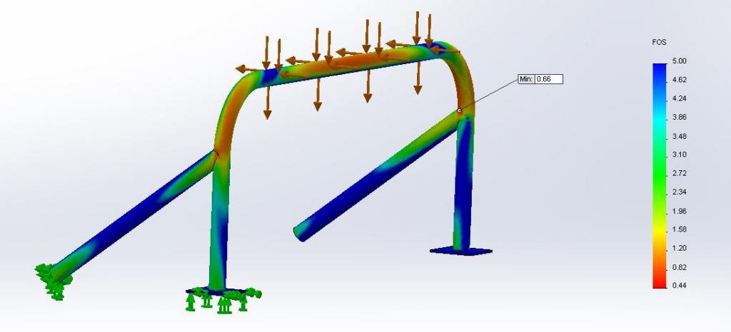 Just ran a sim on 4 point bar traditional style with a main hoop using 1.5OD and 0.12 wall with 75ksi yield strength(TuffDOM) regular DOM 1020 steel is about 60ksi. using same 3000lb loads I got this.