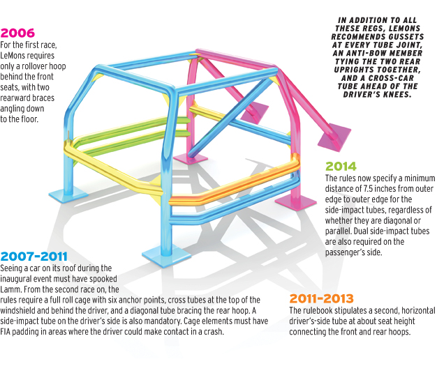 The sanctioning bodies for NASA and SCCA track days also require a minimum of one diagonal support to the main hoop and that your helmeted head not exist at a higher point than a line drawn from the top of the rollbar to the top of the windshield (infamous broomstick test).