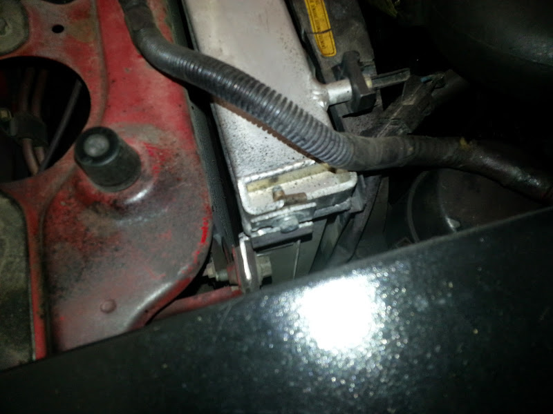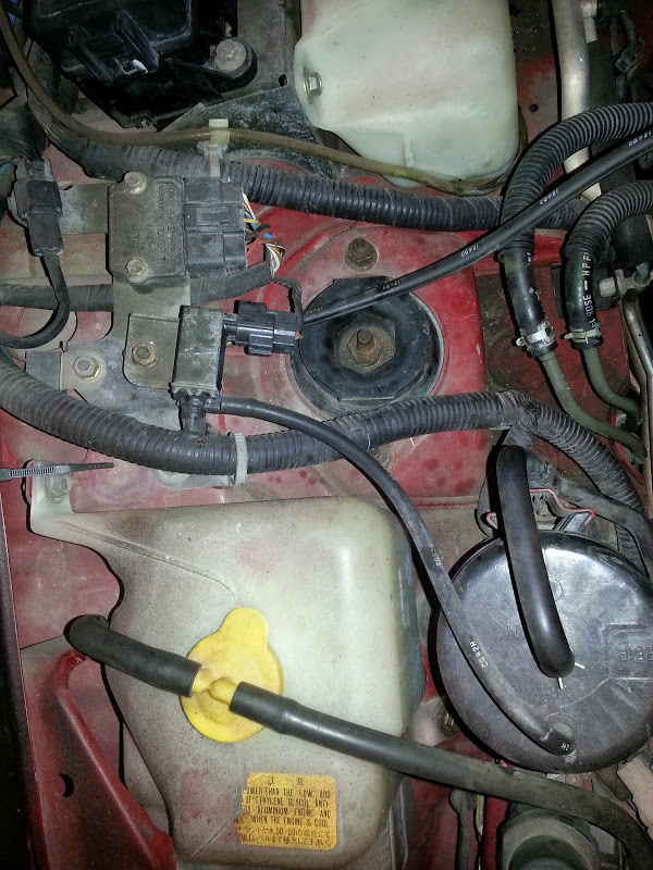 This connector is just dangling near the front of the motor. I think this is supposed to plug into the thermoswitch for the radiator fans The connector seems to be a single lead. Appears to be the right length to plug into something located on top of the coolant housing..