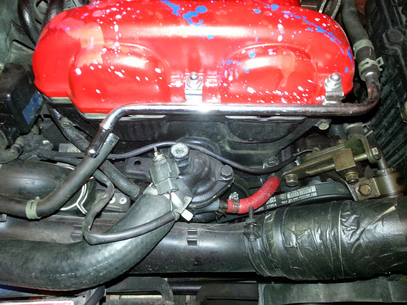 So I bought a ton of crap for the new motor. a new valve cover (including solenoid) for $100, also got a timing belt and associated pullies, a new water pump, thermostat, cam and crank seals, an alternator\water pump belt, rear main seal, The FM hose kit and stg 1 happy meal clutch kit, new input and output seals for the transmission as well as the clutch lever boot. Also purchased a 1999 fuel rail.