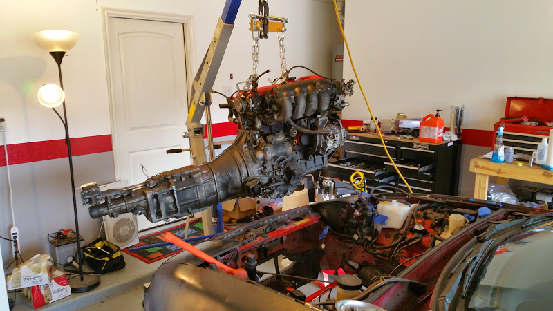 Had lots of fun remating the transmission to the motor all by my lonesome, but that was just a undercard to the main event, which was getting the motor into the car and the motor mounts lined up. Taking the motor out by yourself is not too bad, but putting it back in alone is a huge PITA. I eventually got it done, using a jack from underneath, the invaluable load leveler, and some strategically placed 2x4s. I am probably going to be sore all over tomorrow from all the wrestling of heavy parts I did today.