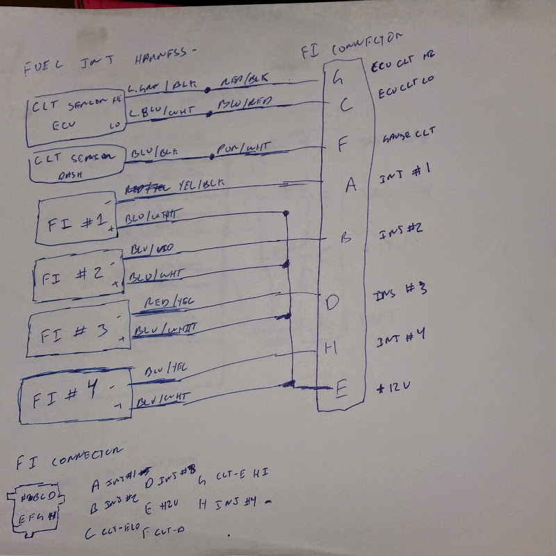 I rewired the 2004 fuel injector harness to eliminate the 3 wire sensor, and add the two sensors from the old motor, as well and allow for sequential fuel injection. Installed before pictures, you will have to make do with my scribbles. I will cut the pigtail on the chassis side of the harness and wire in the other side of this connector to match. Behind it I will connect injectors 2/3 and 1/4 together for now with jumpers, running all 4 discrete wires back to the ECU. If I want to convert to sequential I will just cut the jumpers and modify the ECU harness. I also eliminated the ground and condensor from this bundle, salvaging the 4 pin connector for use on the reworked spark plug connector.