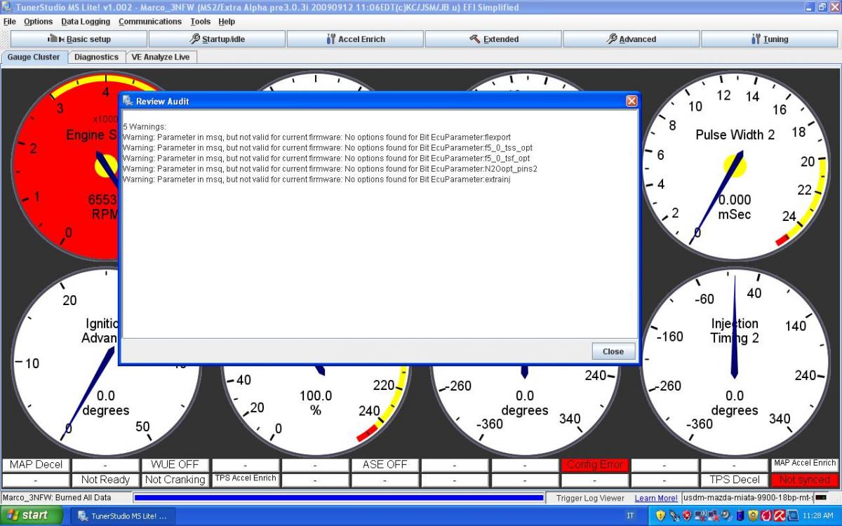I don't know why but something changed from the last time I try the ecu on the car : after the first two startup tests the ecu show me a config error (with rpm to 65535 and no fuel pump). I have reloaded the base map a lot of times but tunerstudio show me 8 warnings that before than it never showed me. Anyway, I have redownloaded the base map from diyautotune and then into the ecu, only 5 warnings and no config error!!!!