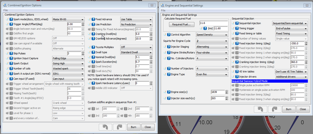 So the car does not start at all using the Miata 99-00 Spark Mode, but it does start very roughly when 4G63 is selected as Spark Mode.