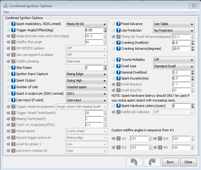 Attached is a screenshot of my current Ignition Options, however after looking at Hustlers commuter MSQ for comparison, I noticed a few options that may explain my issues: