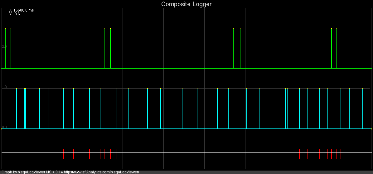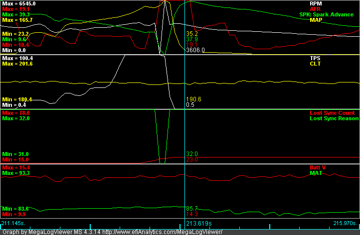 Problem#1: Here's the problem I'm currently experiencing. When I apply the throttle 40% or more I get what looks like a lost of sync. at 3000 to 4000 rpm at 130+ kpa. The RPM drops to 0 for a split sec. and the ignition timing follows causing it to act as a rev limiter. I've monitored this on logs and on composite logs. I have attached some pictures of the logs showing the problem occurring.