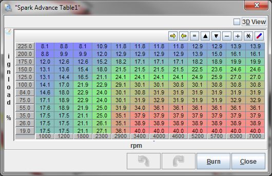 I've found the zip file where that spark table came from and it was tuned for a customers car. They do state that it's only to be used to get your car running and I would asume that the spark and fuel and pretty well dialled in for that particular engine. I won't be using the boost regions of the map and Ill still with my current cells. Driveability and throttle response in the vacuum areas has improved a lot by bringing in the advance earlier on at low load areas, that'll be the charger helped by the dual throttles.