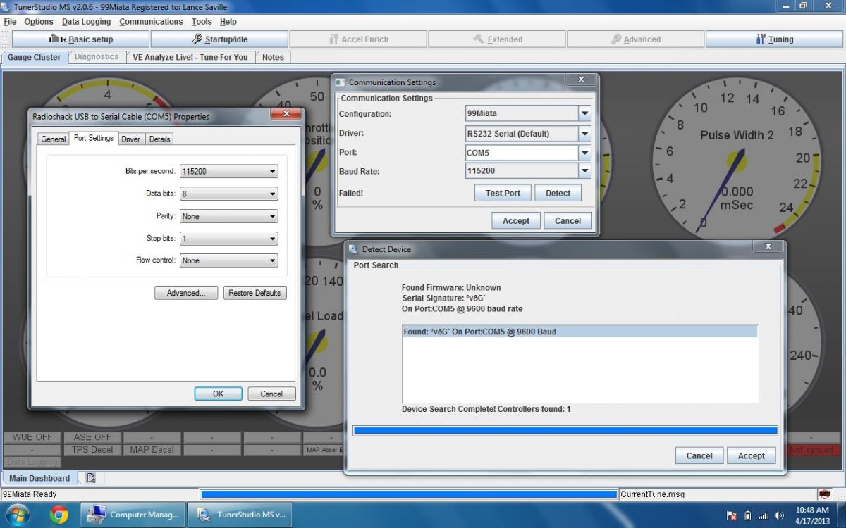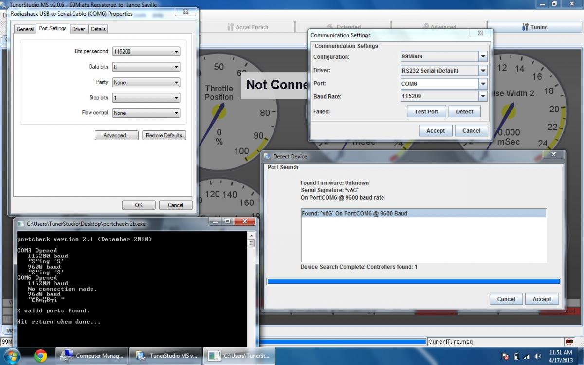 Ran a port scan, It looks like my adapter is only letting me talk to the ms2x at 9600 baud, even after changing the port settings in windows. Com3 in this list is my modem, disabled that just for testing and still same results otherwise. So basically it looks to me like my computer is coming at the ms2x at 9600 baud speed and the ms2x is like wut? A friend offered to let me borrow another known-good cable for testing, it's one of the FTDI ones, hope to report some good news in the next few days. Here's latest screen- oh and on tunerstudio's detect device tool - I'm hoping it says unknown firmware only because it's not able to talk to the ms2x at the proper speed. That's a mess I don't want to add to this mess for sure..
