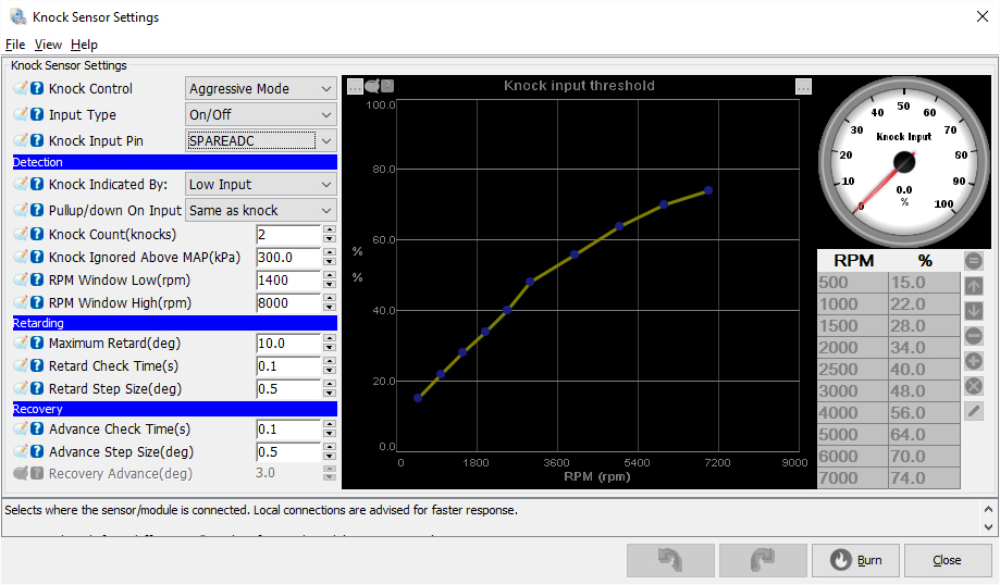 1) I am getting 100% knock on the knock input gauge. I've posted a picture of my knock sensor setting. Does the settings look correct?