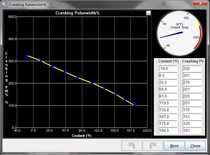 Its an ms2 so the cranking table is in percent as opposed to Ms. I just got back from the garage moving the cranking percent at 70 degrees up and down about 75 percent in small increments and still couldn't get it started...