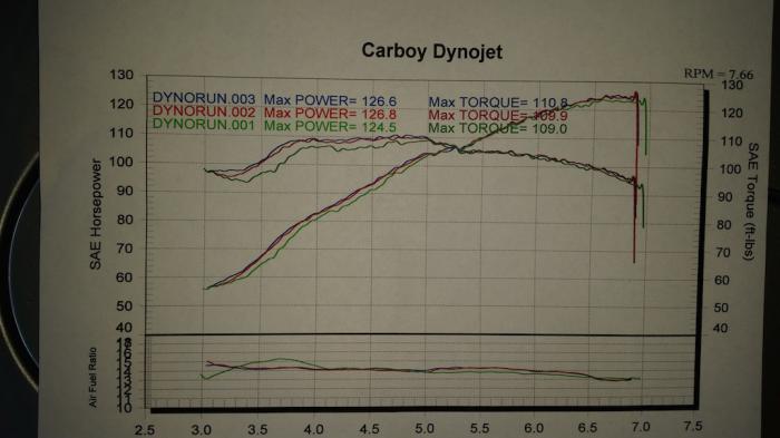 Late to the party on this but I guess why not share. This is an 01 VVT that has unknown mileage but feels real strong. It was an auto trans engine so likely wasn't abused and was very clean inside. Engine has gutted VTCS mani, RB header, short U bend intake, and the DIYPNP. We use the same dyno so a comparison is fair. I used uncorrected numbers. STD correction gives me 135hp, 126tq.