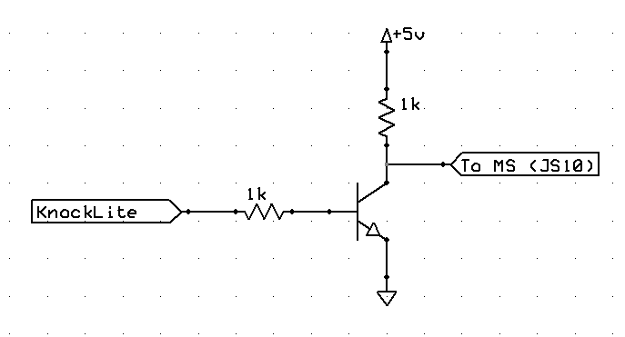 This circuit can be built inside the MS, and it simply causes the signal hitting the MS to be opposite the signal coming in from the KnockLite. When the knocklite is at 0v, the transistor is off, and +5 flows through the resistor to the MS's JS10 terminal. When the knocklite goes to +5, it causes the transistor to turn on and drains the pullup voltage to ground, causing 0v to appear at the MS's JS10 terminal.