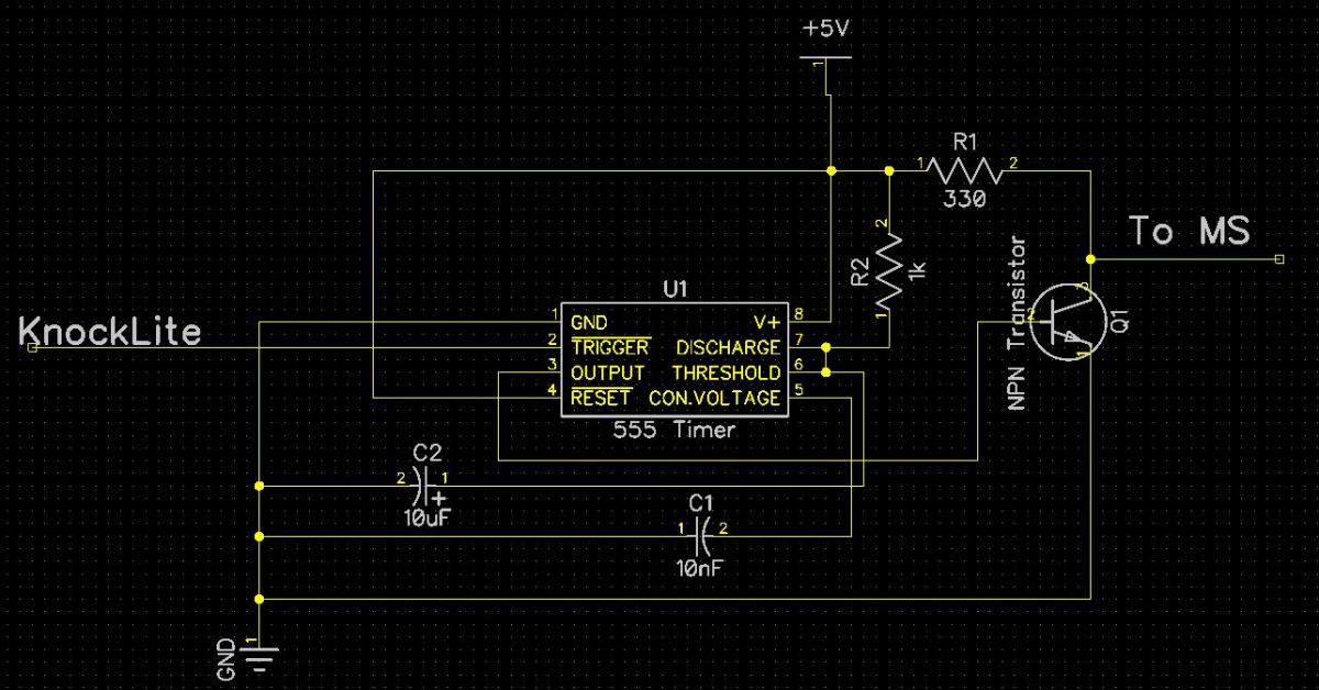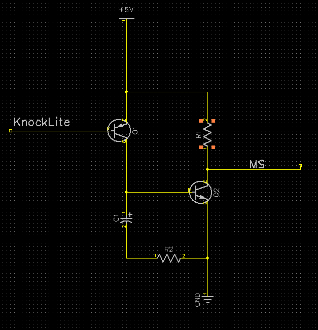 When the knocklite pulls down the base of the PNP, it passes its current through to the NPN's base and charges the capacitor. While the NPN is active, it drains the pullup (the MS gets the low/knock signal) and is kept open for a short time by the cap even after the knocklite returns to a positive voltage (allowing the MS to grab the signal)