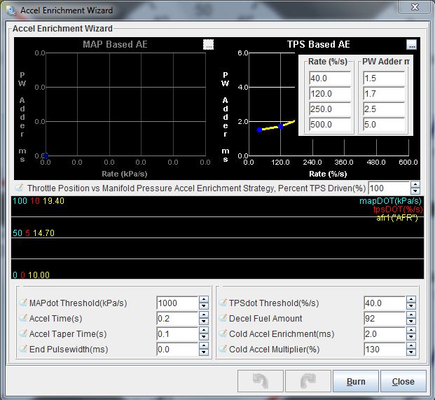 My understanding is TPSacc in MLV shows me the AE pulses, why is AE kicking in here when my TPSdot is 0.0 and doesn't change? Doing my head in, look how it messes with my AFRs! Even the bigger first spike after the little hiccup on TPSdot shouldn't be there because my TPSdot threshold is 40.0 and that little lump is under 30.0.