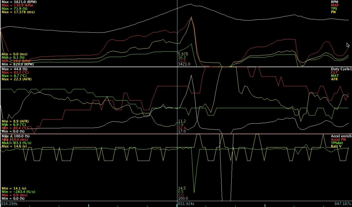 When cruising, afr is fine, but as soon as tps raises just a bit, dutycycle shoots up and afr goes <9.