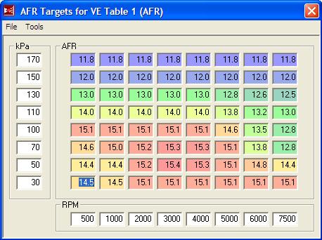 Just like a countour map of a mountain, there shouldn't me a lot of lines in areas that will have a linear rate of change in AFRs. In reality you could have two lines in boost, from 12.5 at say 110kPa, to 12.0 at your max boost, since the program does linear interpolation anyhow.