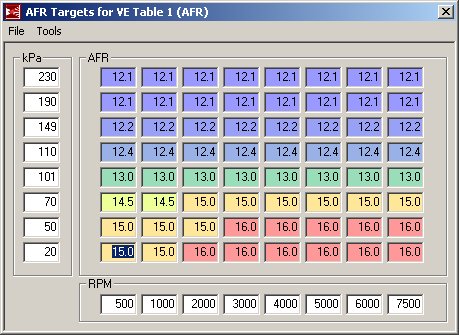 just working my tune a little bit tonite and tomorrow after i swap in my 550's, and figured i'd see what everyone else is using for an afr target table in MLV.
