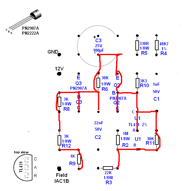 When I have +12V and ground attached I get a similar voltage between the field and ground - varies with voltage input-higher input higher voltage at the field, also with lesser voltage.