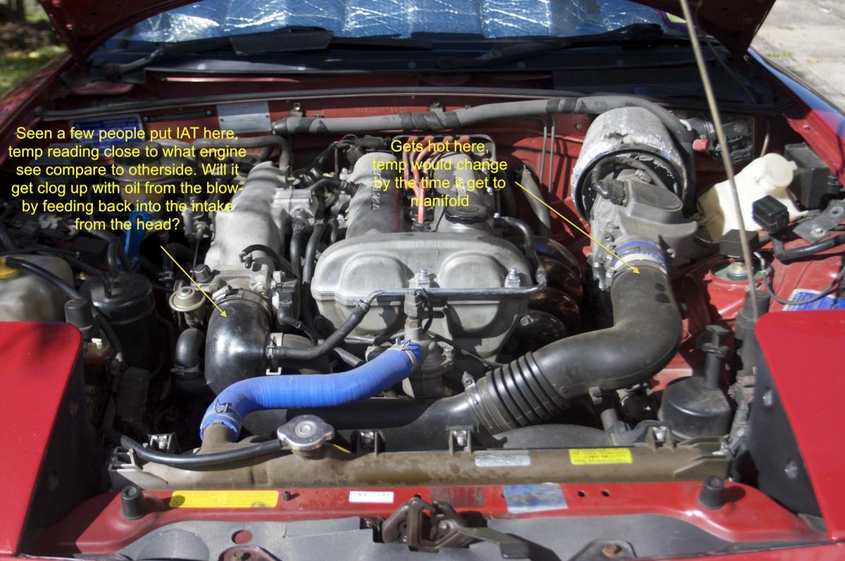 On an n/a car it doesn't much matter because the intake air temp is not that different from the airbox to the throttle body that it's going to cause problems tuning. The airbox is near the toasty warm exhaust parts, and the crossover tube is bathed in air that's heated by the radiator. I took my IAT and zip tied it near the open end of the snorkel that feeds the airbox. I intended that to be somewhat temporary as I was expecting to be turbocharged much sooner, but anyway, the car was tuned with the sensor where it is so I'm not moving it until I do go turbo. It's far enough away from exhaust parts and not in a hot airstream, and it never gets soaked to the point that it substantially affects how the car runs.