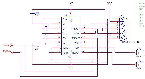 Ok, so I studied the schematics a little more on the MAX232 chip on my board and the DB9 connector. I posted them up for your guys convenience.