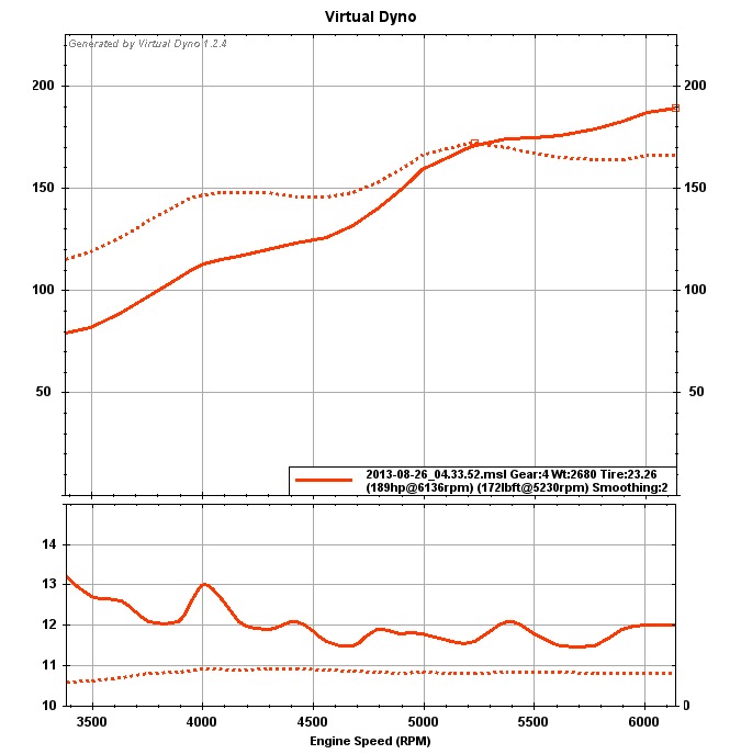 Virtual Dyno tells me it is about 189hp and climbing. I didn't even go to redline.