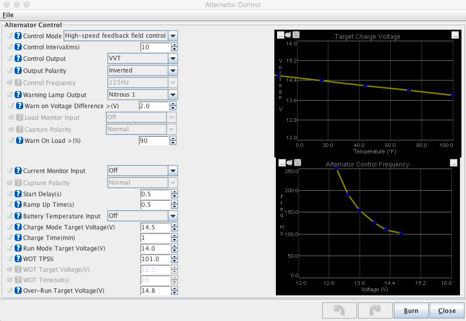 This is a screen shot of my alternator settings. This was a basemap from Braineack being used to control my 99. I think your settings should be very close if not exactly the same as this.