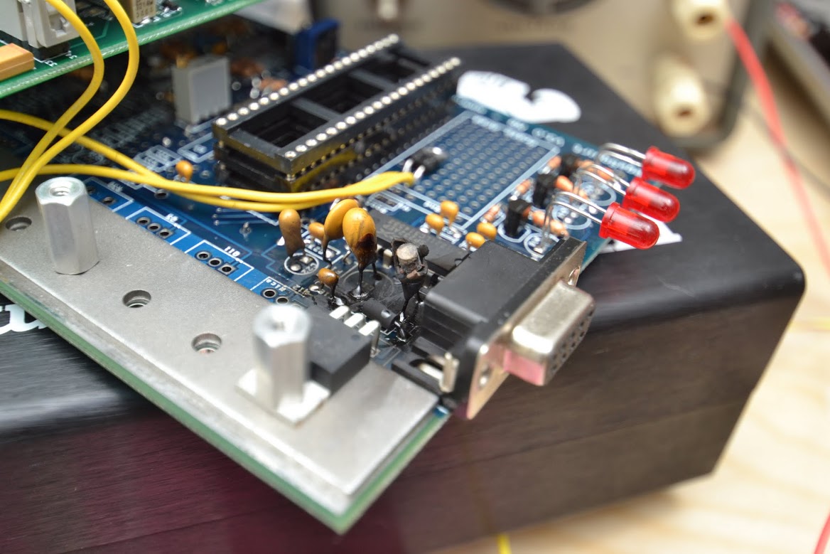This board ran perfectly on the JimStim, without CPU, for several minutes while I was checking voltages and adjusting pots. Then it ran again for quite a while with the MS3 + X board while I screwed with R11. Interestingly, no matter how I screwed with R11, the voltage on the lower leg of R17 refused to move. It was (IIRC) 2.6v, I wanted 2.75v to be in the middle of the 2.5-3v range, but after a while I gave up. Perhaps this was a result of the bridged vias? Hmm.