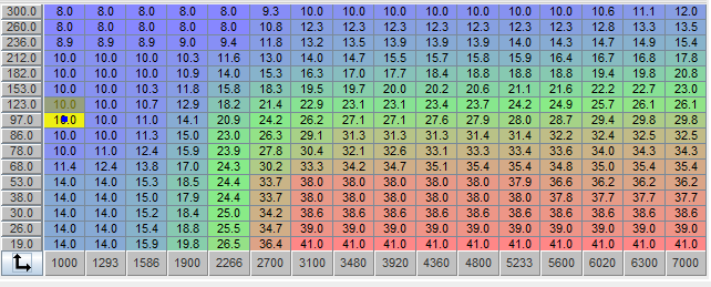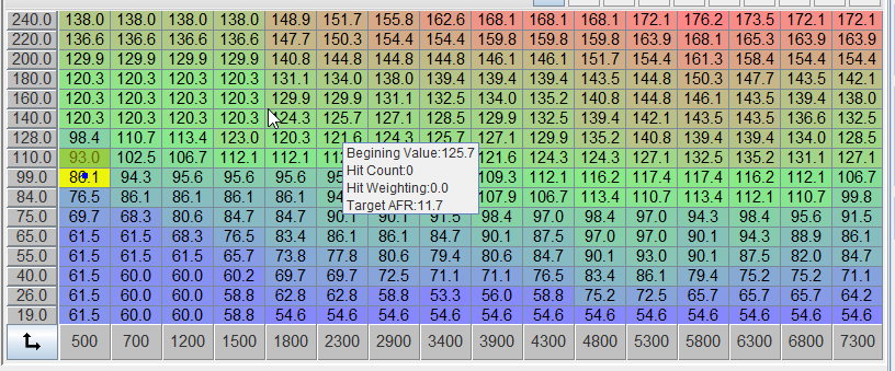 VE Table: Adjust the values at the idle kPa and rpm to get it to idle. You want to change the VE table entries while watching the engine MAP (in kPa) to try and lower the MAP as much as possible. Do this after the engine has warmed up. As you do this, the engine rpm will rise, and you may have to adjust the throttle stop on the throttle body to lower the rpm back to the desired idle speed. Once the idle VE are tuned, you will have to retune the afterstart and warmup enrichments.