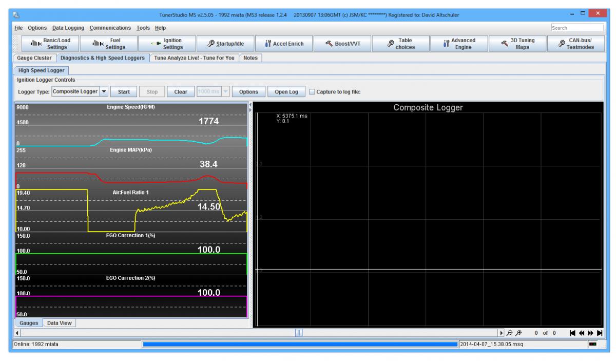 Hey guys. I have a 1992 miata 1.6. 550cc injectors, and a MTX-l wideband with a MS3 built by Rev. I got everything wired up recently and im trying to get the car to idle so I can set the timing. The car fires with a pop usually and idles fine for a second then the AFR starts climbing and the car starts to die. Any ideas? Heres a datalog