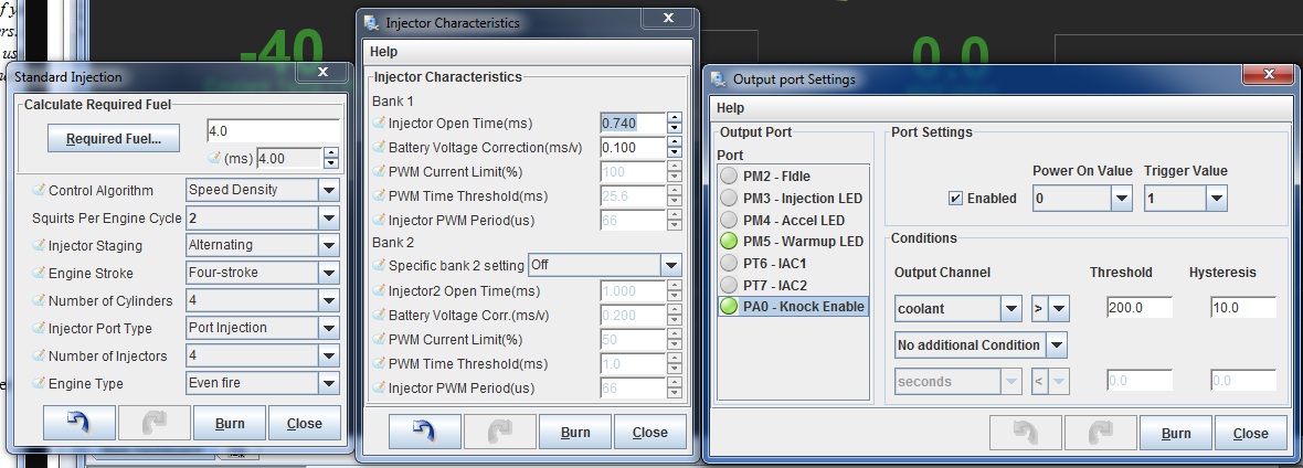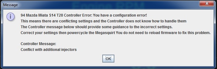 I'm getting a config error: conflict with additional injectors. I haven't touched the sequential settings from what Brain initially set. I've only done REQ_FUEL, injector opening time. Keep in mind, I don't actually get the car to idle somewhat unless with a req_fuel of 7.0 or higher. The picture has it at 4.0 as I thought maybe it was complaining about that. with my 850cc injectors, it should be at 3.6......