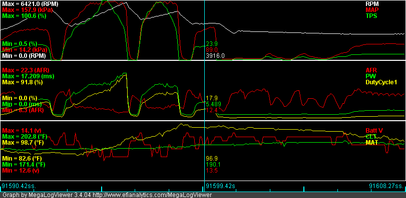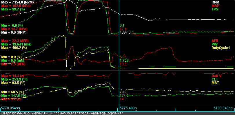 Right smack dab in the middle, you can see the CLT/MAT climb. Great, it's boosting, getting hot -- normal. Uhoh, getting close to CEL time. Running out of revs, shift ....