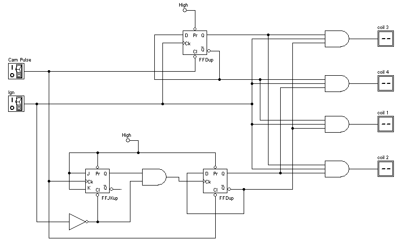 I was playing around with a digital circuit simulator and came up with a circuit that should split the signal from MSII to 4 separate coils using the cam angle sensor on 99+ Miatas.