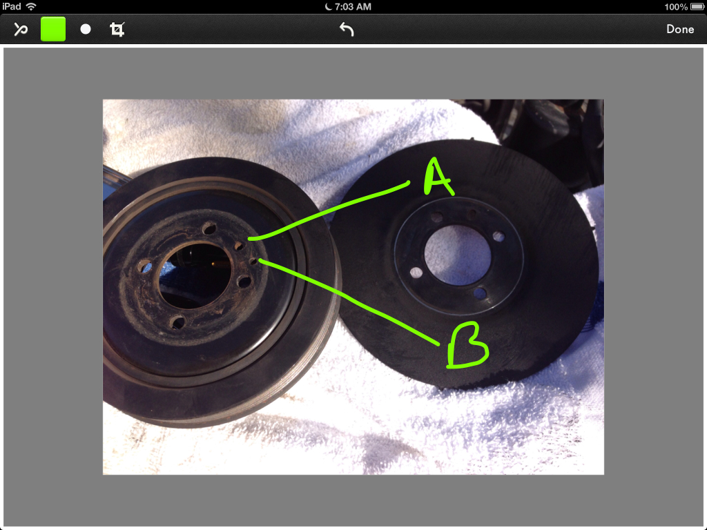 It appears I did put it in upside down: the rusty side of the wheel should be facing the rusty side of the pulley. Shiny ring side of the pulley should face the crank. I might have even made that shiny ring while cranking with these pieces loose..