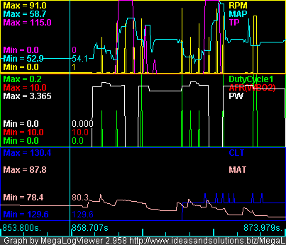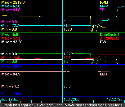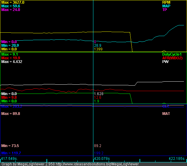 Judging by MAP and BattV, you're cranking continuously throughout most of this frame. And yet RPM is indicated as 0 or 1 throughout most of the frame, with a couple of spikes.