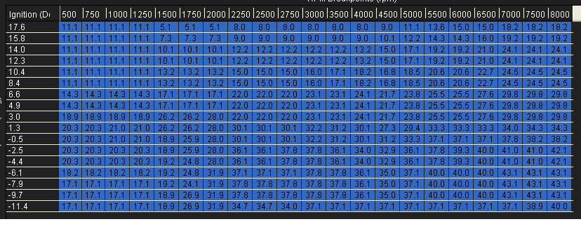 Take a look at this screen shot. I was running 12.5-13 :1 AFR's at WOT before this timing map. Now I'm running 14:1 ish? Weird.