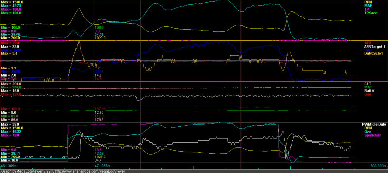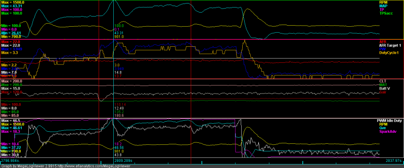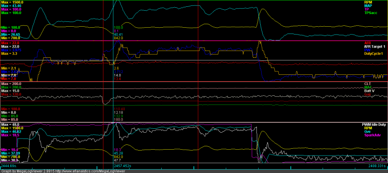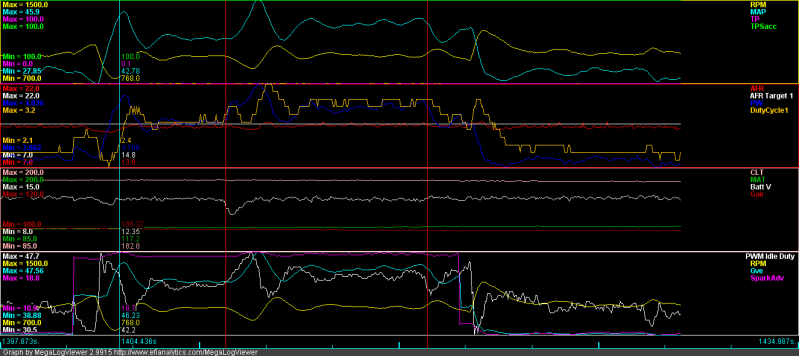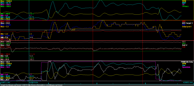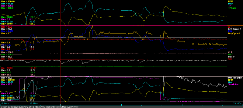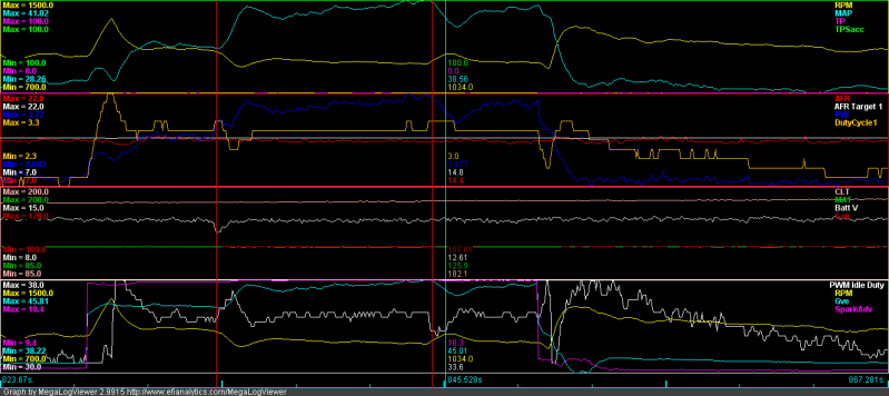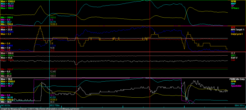 * I attached the log, could someone please take a look and help me figure out the weird spike in RPM/PWM idle duty after I turn off the lights? It was a one off, didn't happen again but I can't explain why...