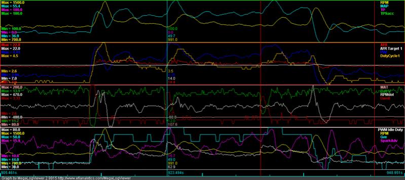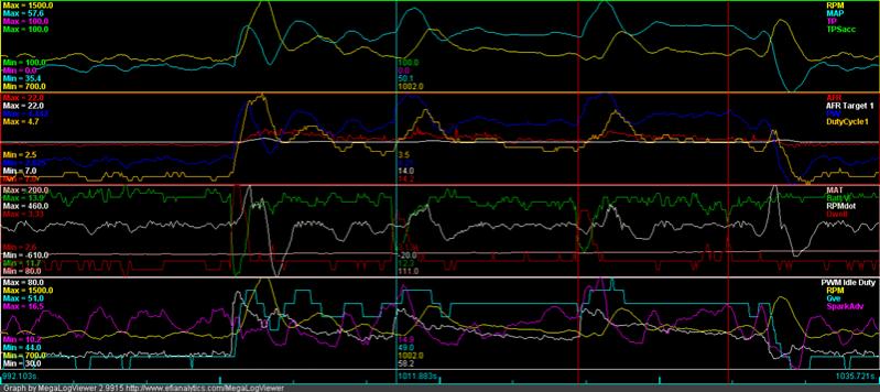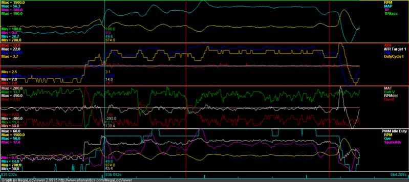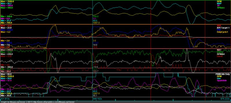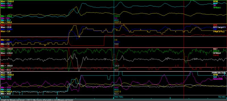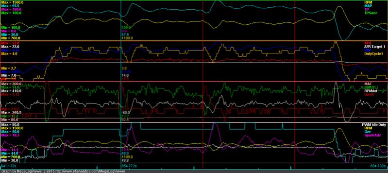 The vertical line/markers indicate the headlights being turned on & off. Pay attention to how the PWM Idle Duty responds to voltage droops, and how it affects the RPMs, and how the battery correction factor changes it.