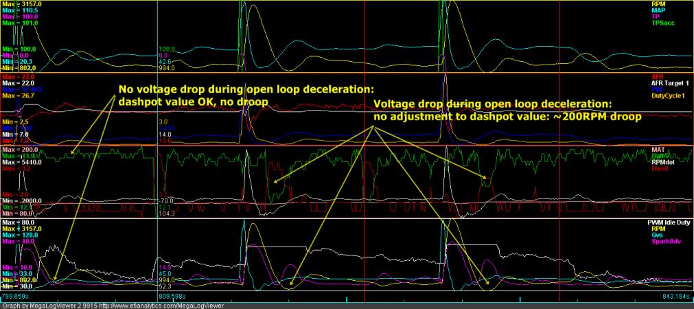 Noticed this while reviewing the logs... if the voltage drop/electrical load occurs during deceleration while in open loop and the software dashpot is engaged, the calculated dashpot value ends up too low and a ~200 rpm droop occurs. Not a huge issue, but if the idle valve voltage correction could be applied to the dashpot value, it would get rid of this issue. It is relevant because if you apply a TPS cutoff to the AC compressor, there will probably be a greater chance that it will re-engage during the deceleration/dashpot event.