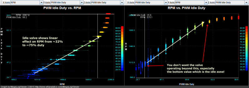 I think everyone should test their own idle valves and figure out the duty range where the change in RPM is linear. And make sure the valve is only working in that area. Otherwise, closed loop calculations will be wrong. The bottom value is important because that will be most involved during idle.
