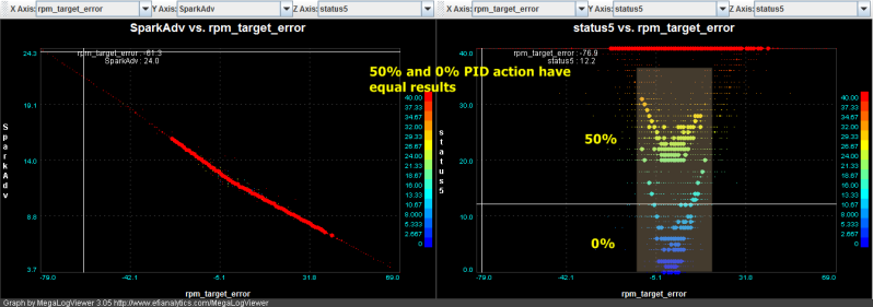 Status 5 indicates the value of P (so we can log Adaptive PID Reduction)- for the 50%, you see that the value of P (40) is reduced to 20 (at the bottom of the V). For the reduction factor of zero, we actually end up with a P value of zero at target! The width of the V and the clustering of the dots at the valley show how closely the RPMs stick to target. The red line up top shows no PID reduction applied.