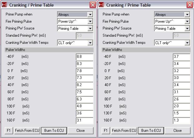 I am running 550cc injectors now, the first night I put them in I started the car up before going home and it started fine and idled fine (a whole 30sec), but the next day that I tried it seemed to flood out and wouldn't re-start. I decided to send the injectors out to get flow tested since they were used and the previous owner was acting shady about them, and they are 550cc after all. Do these cranking settings make sense? I just used the difference between the 230s and the 550s and adjusted the original cranking settings ( 550/230=2.39, original setting/2.39). I figured it would be close enough to start it but its only good for one cold start. Do these numbers seem unusually low or high? Stock on the left new settings on the right. I put them back in earlier tonight but didn't have the laptop so I will try again tomorrow.