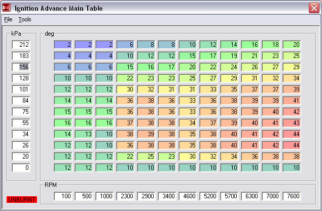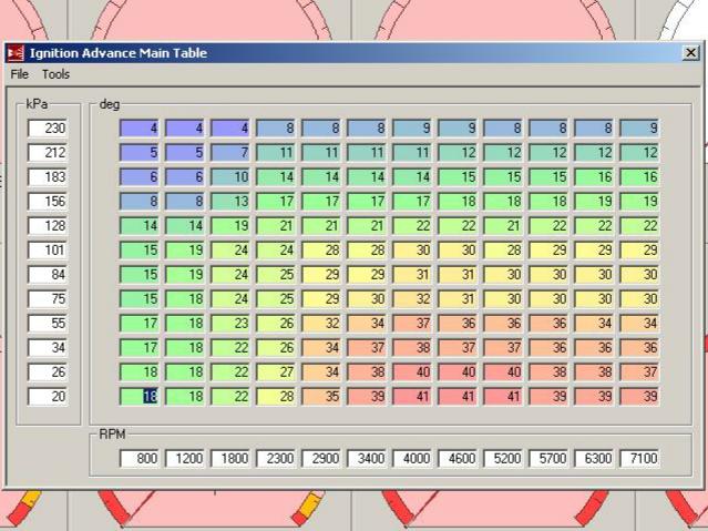 Scott I'd actually change that 1000 column to 1300 or something so your idle isn't crossing a boundary into high advance. Or maybe even ditch the 500 column, make it 1300, and put a 1800 ish column between 1300 and 2300 and run about 2 degrees less than the pink cells there.