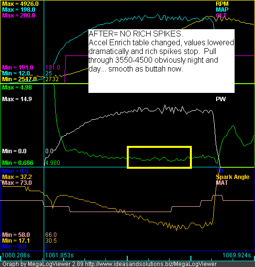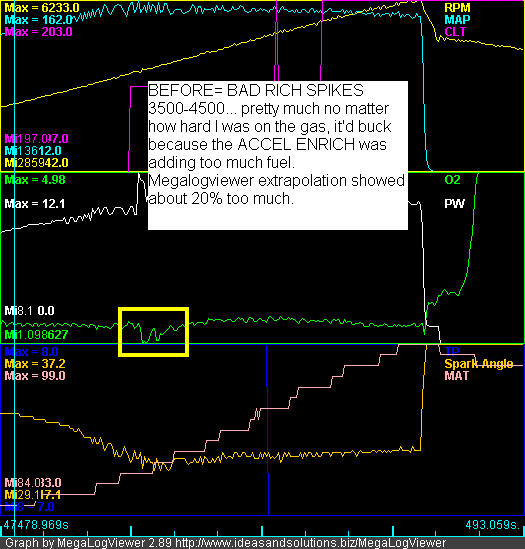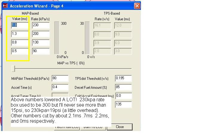 My first run I just lowered the top block from 300kpa to 225kpa and lowered each value by 1.0. It didn't help. Then lowered it some more... then some more. The results are good. The accel was just adding WAY TO MUCH fuel. Now it's not. Now it's good. Now I'm happy. I owe everybody a round.