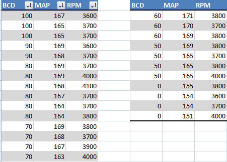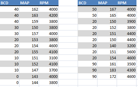 During 3rd gear pulls, I looked for my RPM at 165-170 MAP. The RPM was consistently around 3600-4000 for 165-170 MAP while decreasing boost duty 10% at a time from 100 to 50.