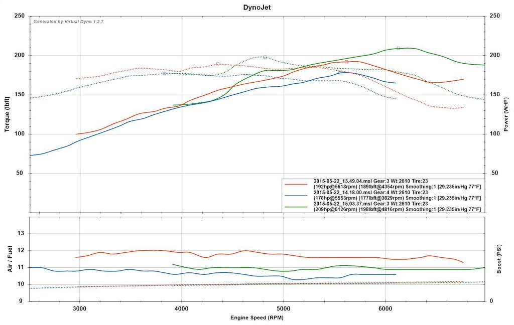 Red is 3rd gear, with water injection on, 14 degrees timing.
